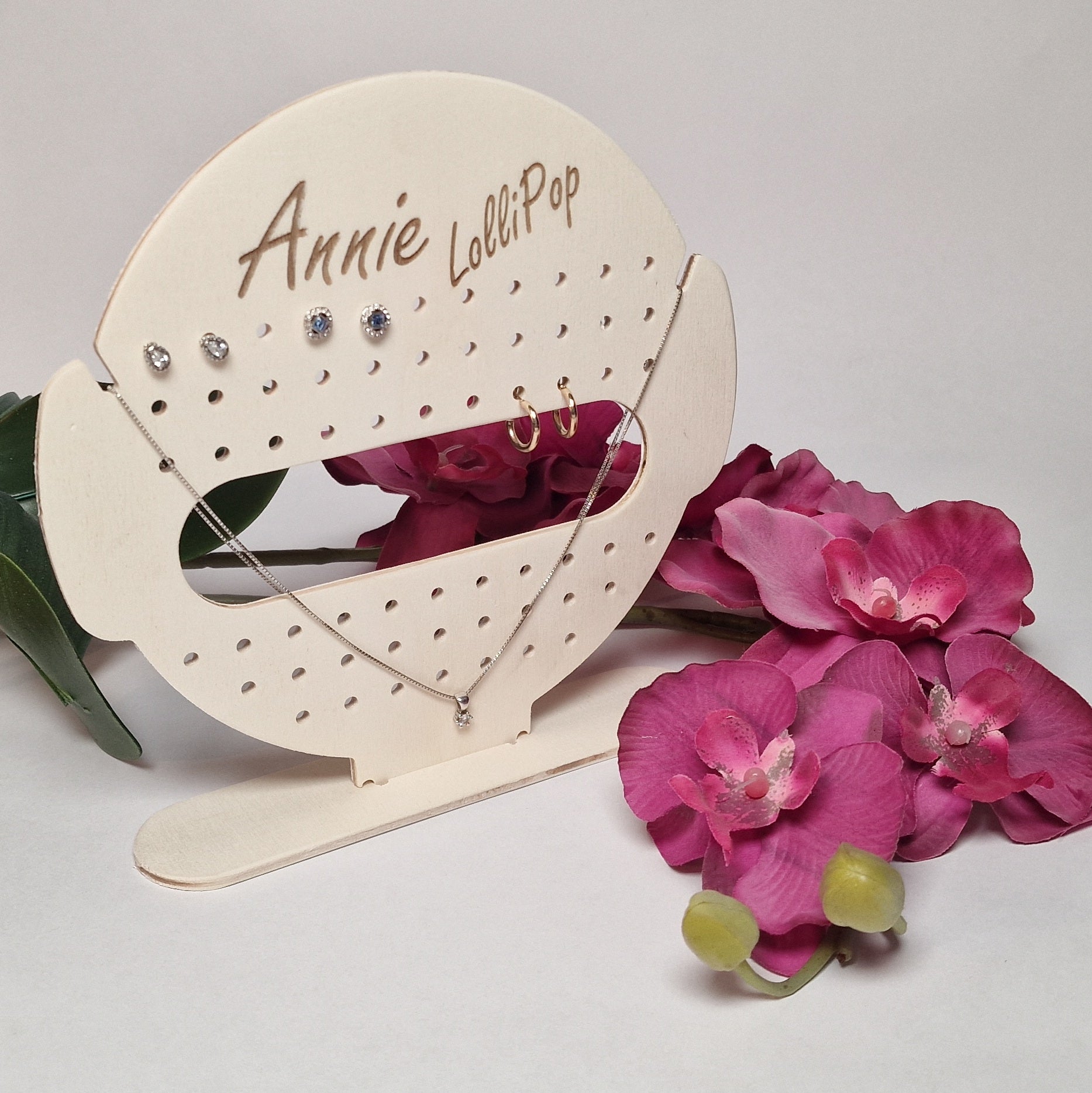 Add a touch of decor while showing off your favorite earrings in style. Our wooden earring racks are perfect for organizing all your earrings. Our racks are perfect for all ages and make a great gift for anyone from your granddaughter to grandma! The stands are made of 4 mm poplar wood. The name and design are laser engraved into the wood.