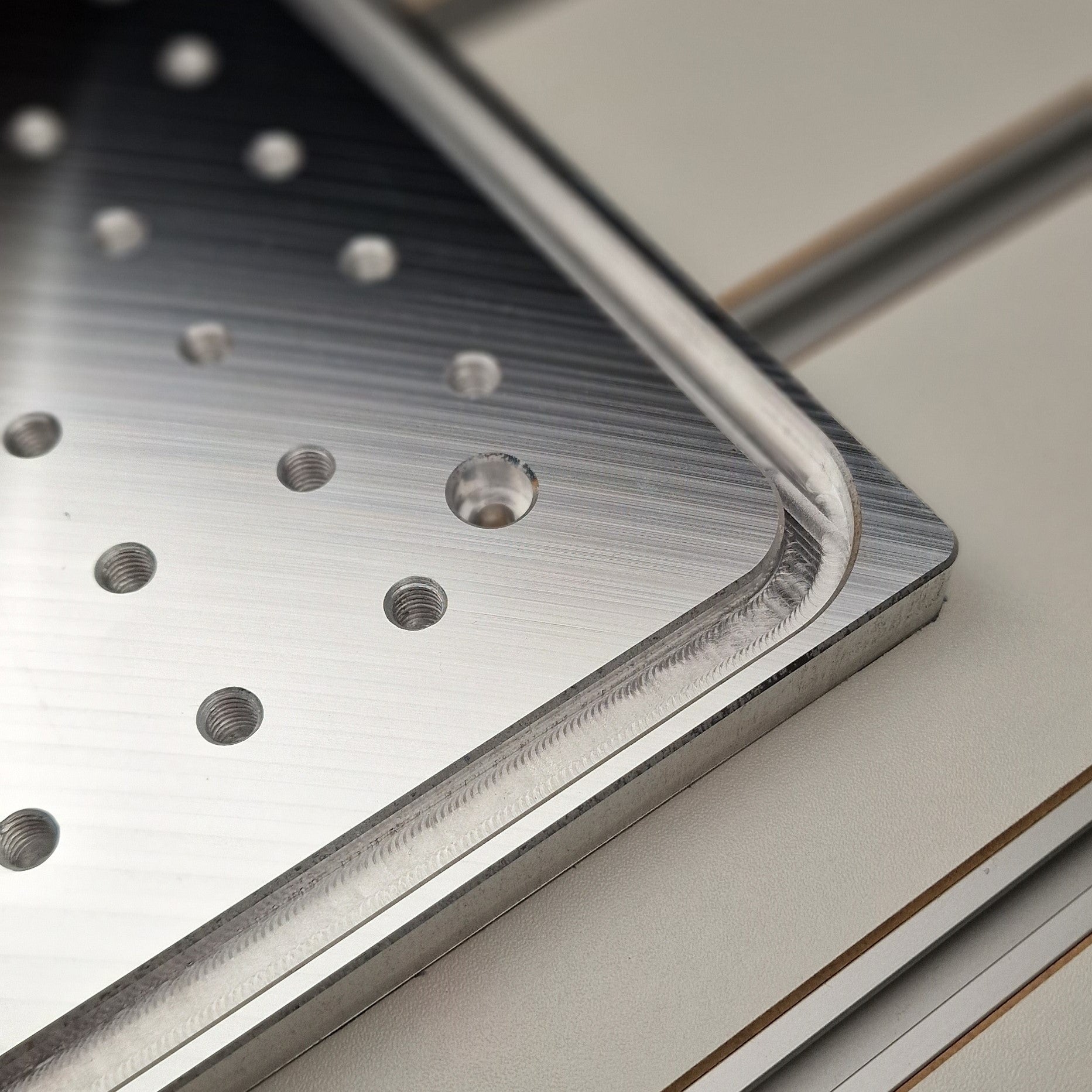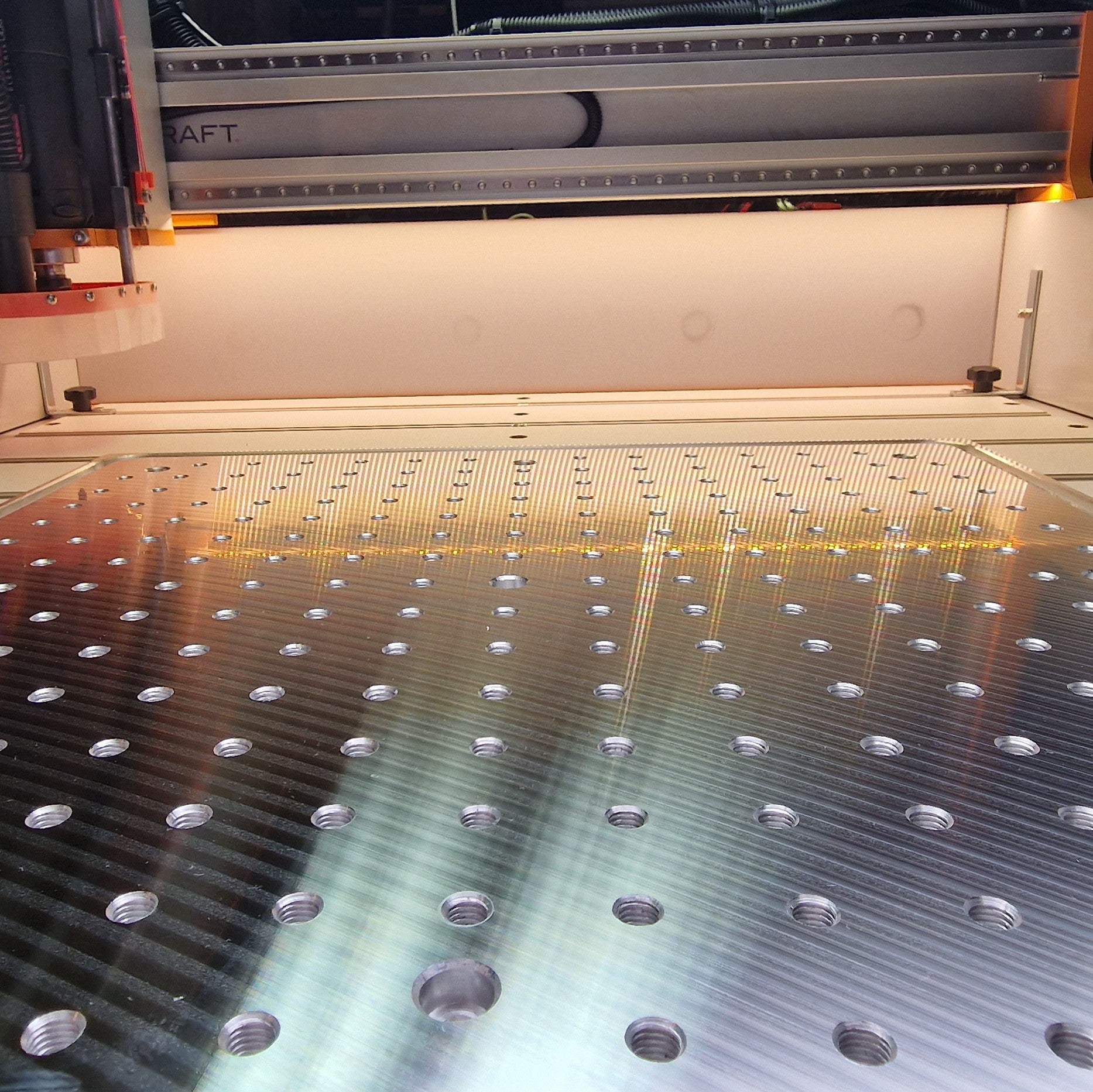 The size of the mounting plate is 500 x 500 x 15 mm and it is made of hard aluminum 5083 Al plankast, which is milled to thickness and protected with foil.