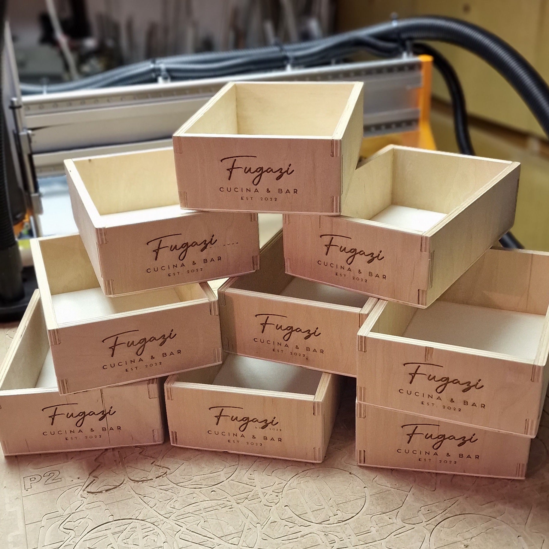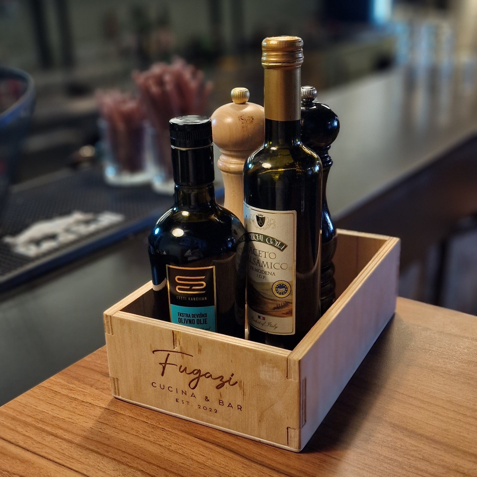 Wooden serving boxes for cutlery, oil and vinegar in a restaurant or bar